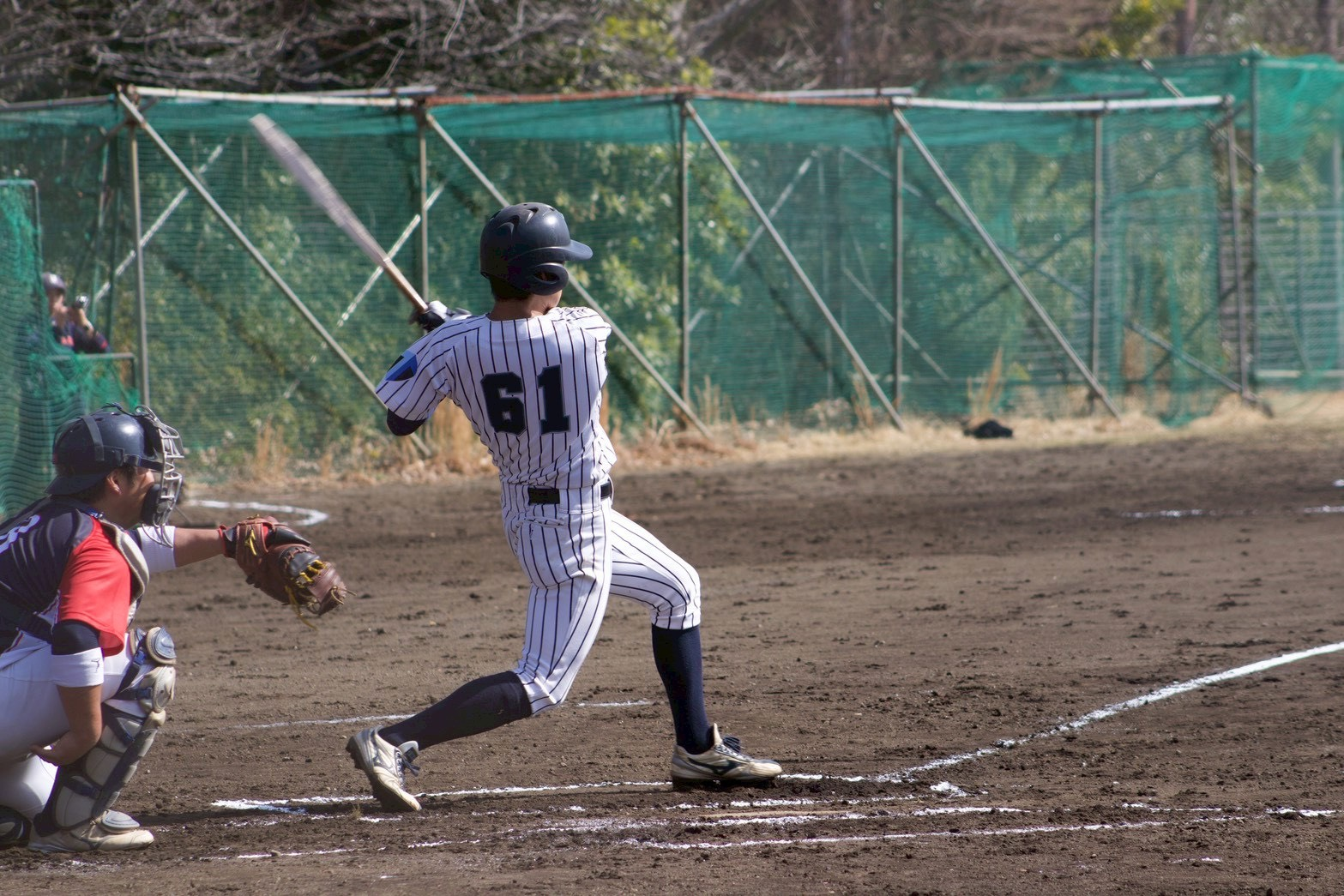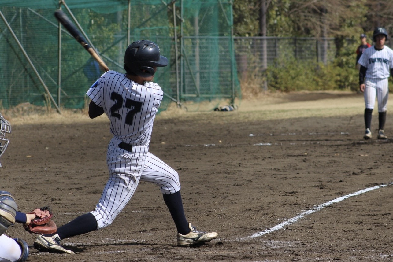 6回裏から指名打者となった大河内(人文社会・新4年)がレフトオーバーのツーベースヒットを放ち、1点返します。