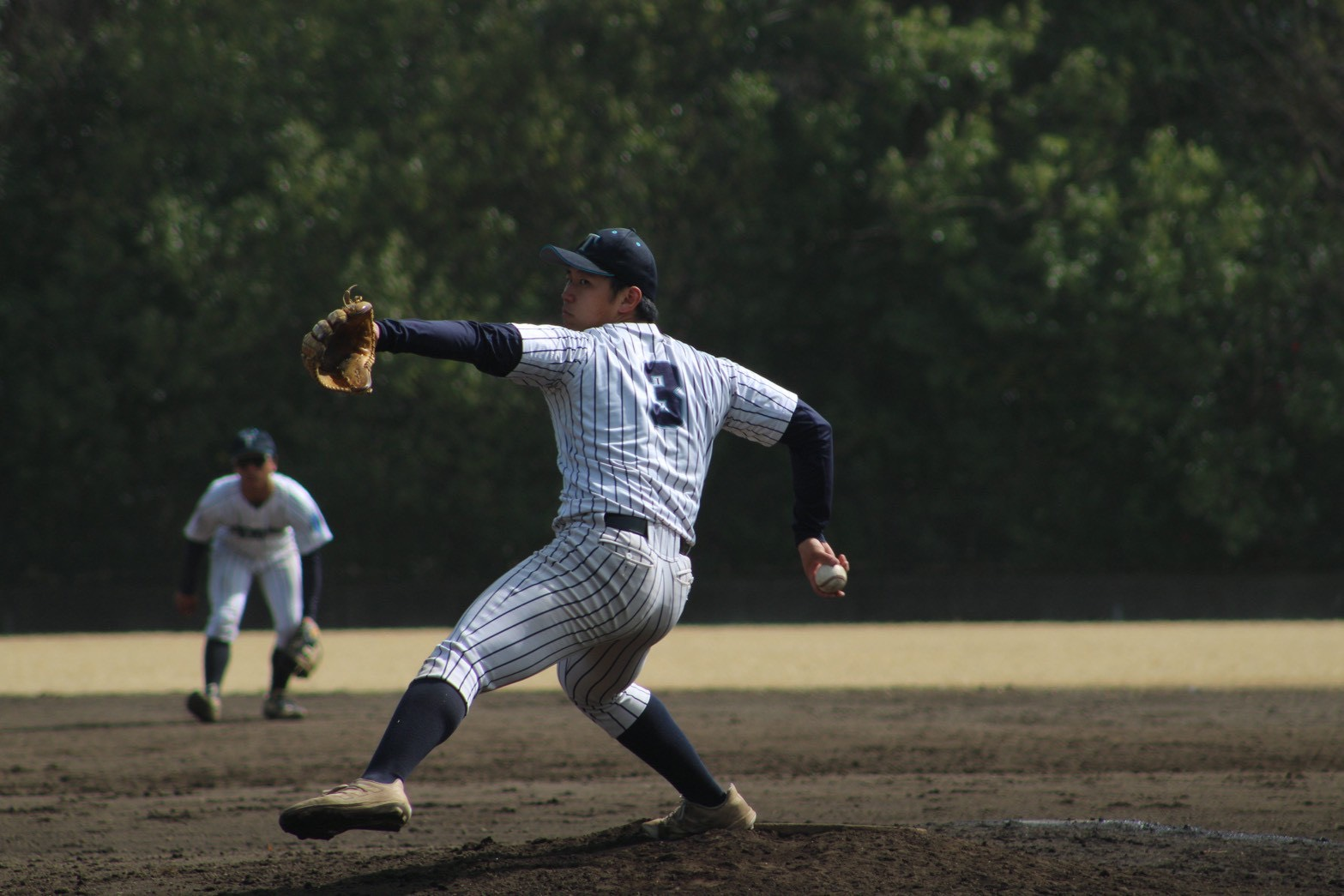 3回表からサードの守備についた宮下(経済経営・新3年)のセンター前ヒットで一死一・三塁とします。